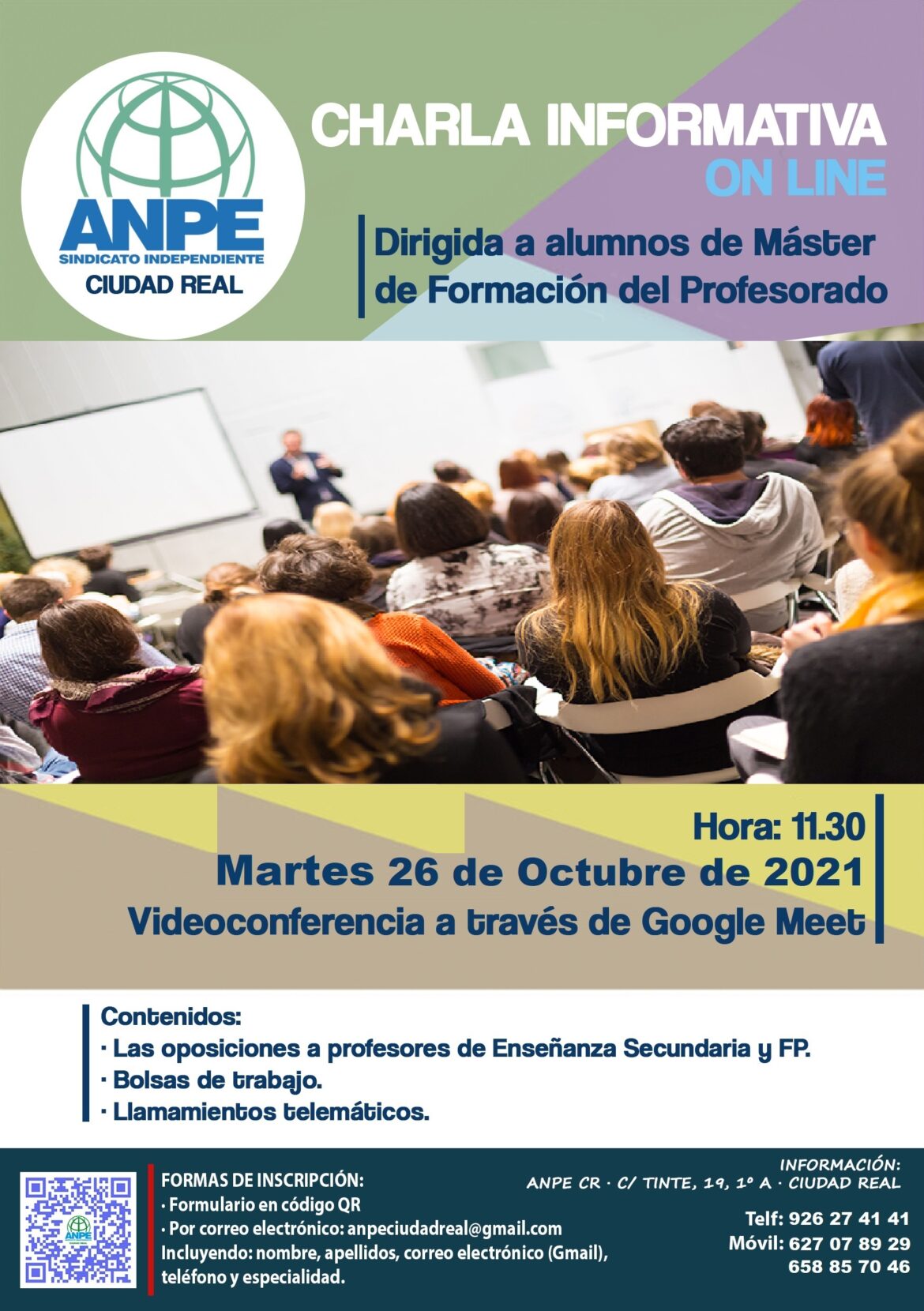 ANPE va a realizar una charla informativa online el martes 26 de octubre a las 11:30 a través de la plataforma Google Meet a la que te invitamos y en la que se explicarán los aspectos más relevantes del Sistema de Acceso a Cuerpos Docentes, tales como:
